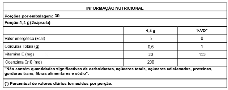Óleo de girassol, coenzima Q10, água purificada, emulsificante lecitina de soja, estabilizante cera de abelha, regulador de acidez hidróxido de sódio, gelatina, umectante glicerina, corantes dióxido de titânio, azul brilhante FCF, tartrazina, amarelo crepúsculo, óxido de ferro vermelho e azorrubina. Colorido artificialmente.