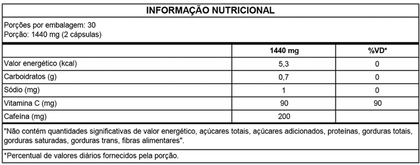 Guaraná em pó (Paullinia cupana), psyllium (Plantago ovatae), ácido ascórbico (Vitamina C), cafeína, antiumectantes estearato de magnésio e dióxido de silício; cápsula: gelatina, água purificada, corantes dióxido de titânio e azul brilhante, e corante natural de urucum (anato). COLORIDO ARTIFICIALMENTE.